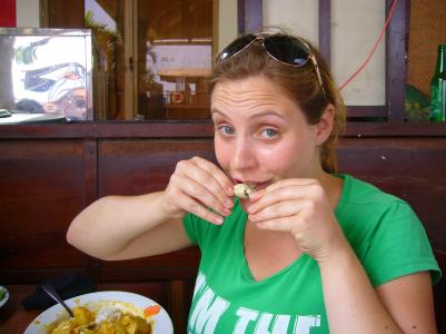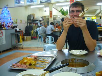 Satay beim dem man verschiedene Fleisch-, Fisch- und Gemüsesorten an Holzstäbchen in eine scharfe Erdnusssoße dippt und in dieser kochen lässt. Quasi Fondue für Fortgeschrittene…